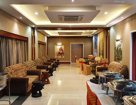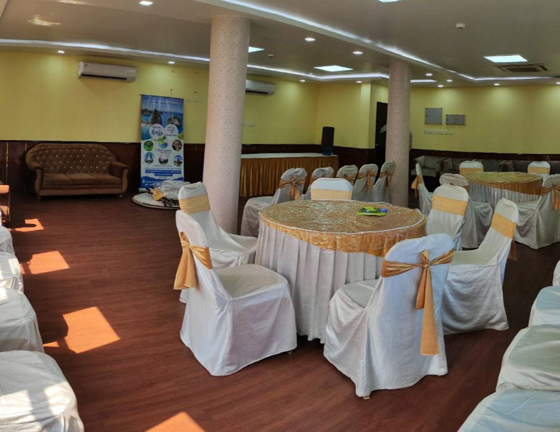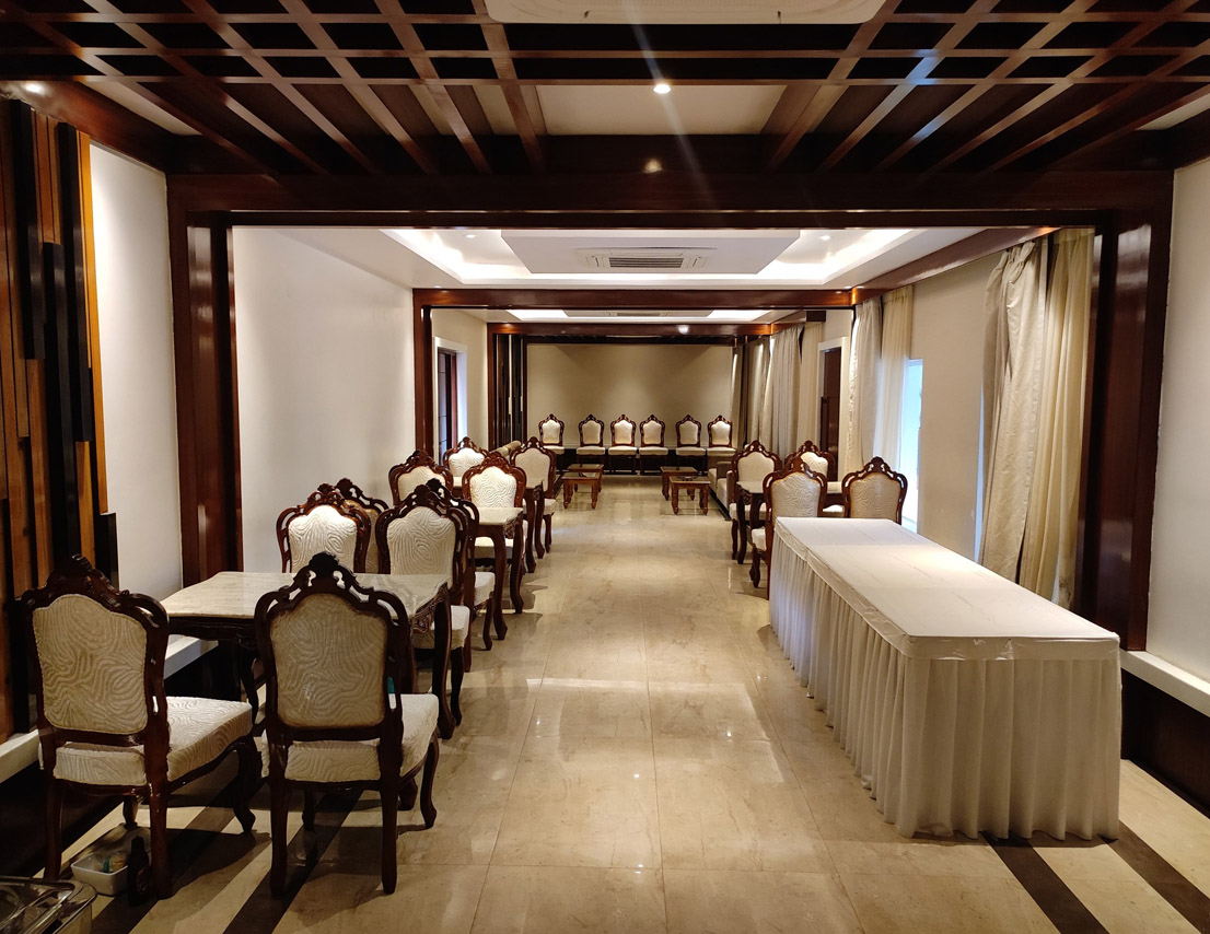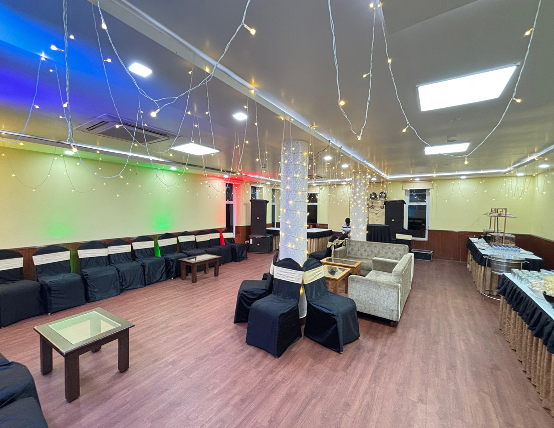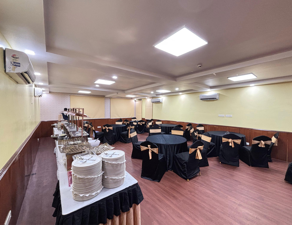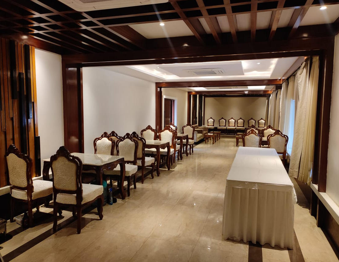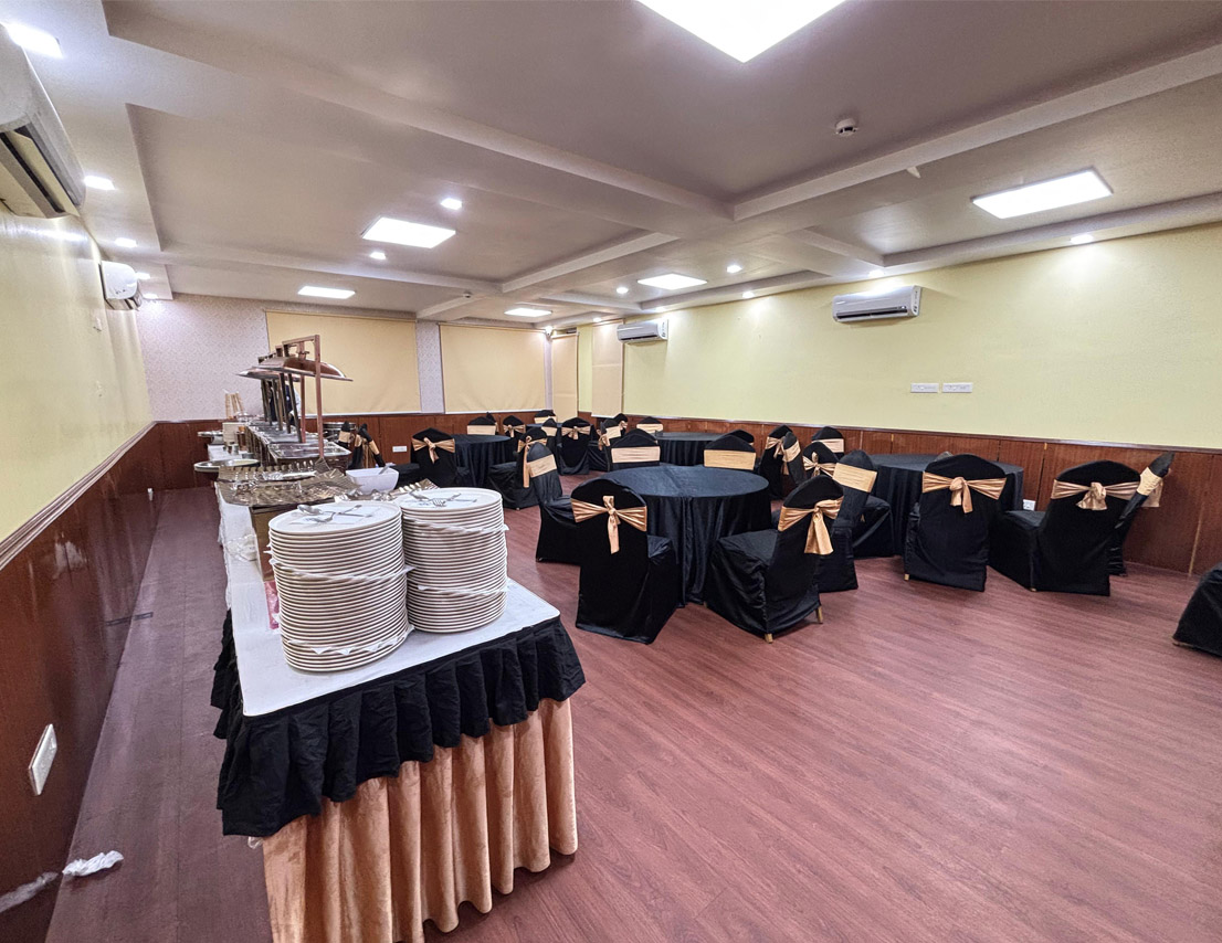 Located on the first floor, Sapphire is a 396 sq. ft. fully air-conditioned banquet hall, thoughtfully designed for small gatherings, get-togethers, and boardroom meetings. With no adjoining open space and stair access, it offers a peaceful and exclusive setting for both corporate and social events. The well-appointed interiors and comfortable seating arrangements make it a top choice for professionals and hosts who value elegance and efficiency. Whether it’s a business discussion or a private celebration, Sapphire ensures a premium experience in a sophisticated environment.